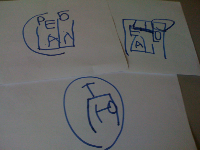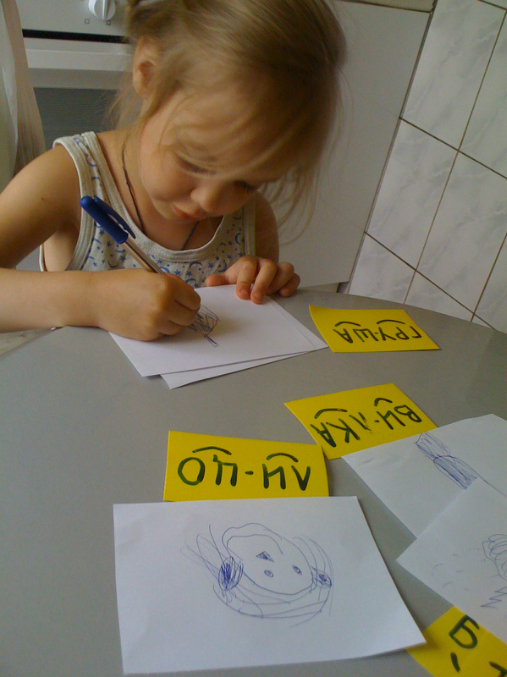 Раздала нам листики и написала на квадратах слова. По-очереди вытаскиваешь квадратик, читаешь что написано и рисуешь.