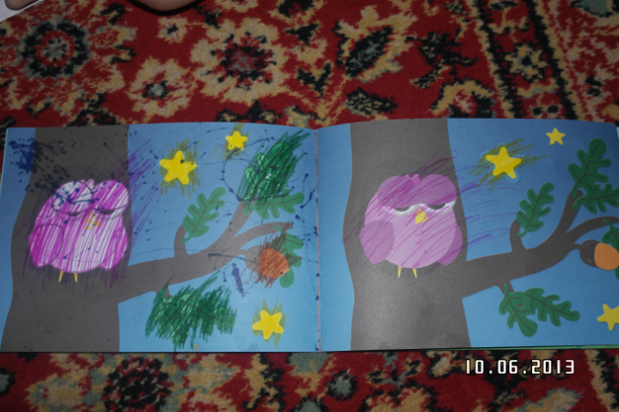 справа рисунок был готовый...слева сову нужно было закрасить в фиолетовый, звездочки желтые, листочки зеленые, орешек коричневый...неаккуратно, но правильно!