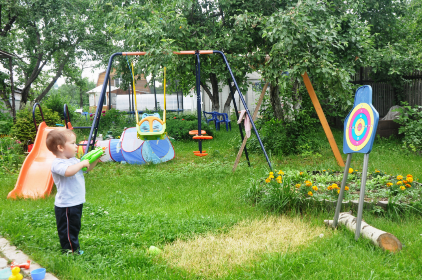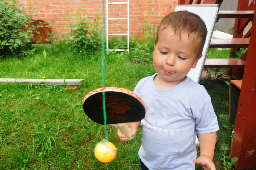 Аналог тенниса - шарик привязан к горке. Ракеткой по нему достаточно сложно попасть для ребенка - вот тебе и тренировка координации движений, крупная моторика.