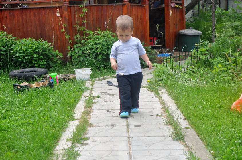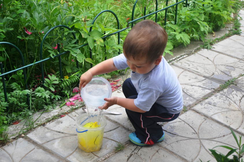 А это - это было упражнение из серии "перенести в ложке". Дома я такие не устраивала - не лотела мыть полы досаточно часто, а на природе - пожалуйста! Так вот в одном ведерке была рыбка без водички, а в другом ведерке на расстояние от первого была водичка. и в ложке нужно перенести водичку для рыбки. Костя отлично понял все, два раза прошелся с ложкой, потом подумал что он ерундой занимается, взял ведро и...