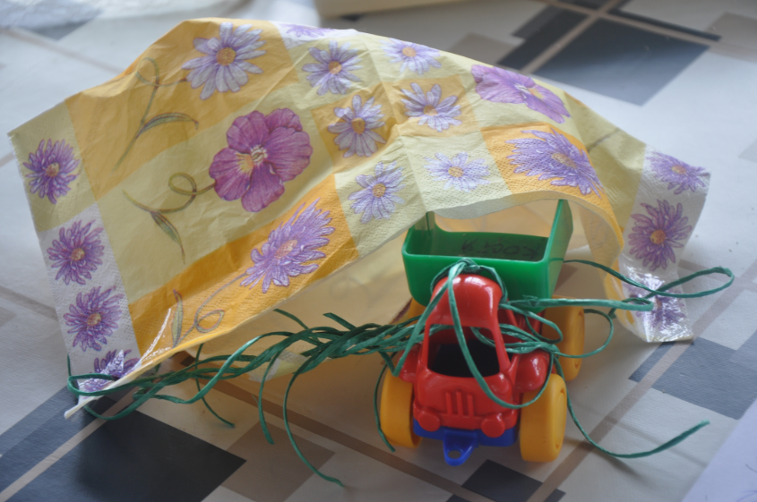 Запускали машинку с парашютом! Это очень весело! мы этим занимались по 20 раз в день! И в балкона, и из домика и с лестницы! Углы в салфетки нужно проклеивать скотчем, чтобы не порвалась салфетка.