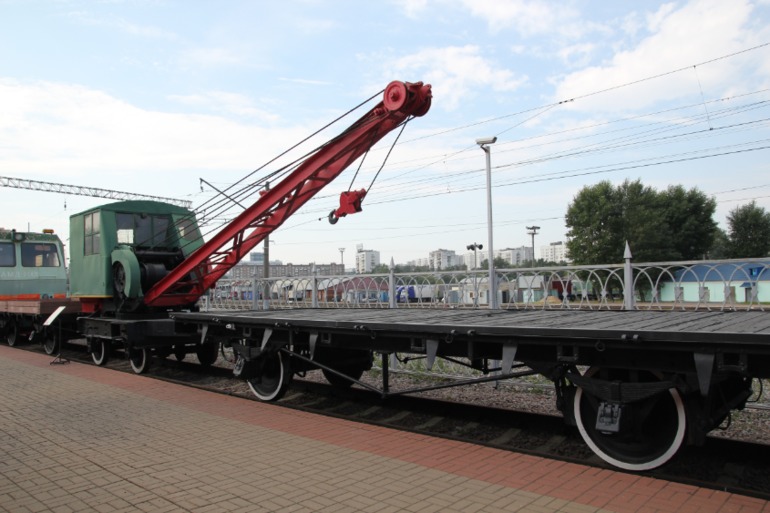 Железнодорожный кран на платформе, передвигающийся по железнодорожному пути.