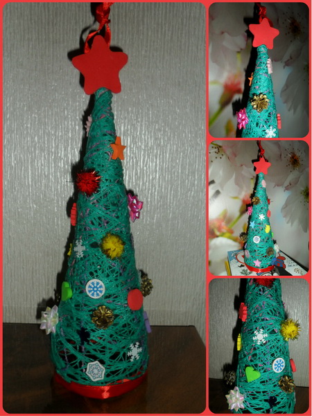 Красивая открытка. Я тоже собираюсь в такой технике порисовать, да все руки не дойдут.А вот и наша готовая ёлка. Когда основа из ниток высохла, я сняла ее с конуса, и мы занялись украшением. На верхушке я привязала красную ленту (т.к. это ёлочная игрушка в садик), затем вырезала из декоративной пенки звезду (2 стороны) и приклеила ее сверху, спрятав внутри узелок от ленты. Потом приклеивали украшения клеевым пистолетом (я капала клей, а дочка приклеивала на ёлку, я немного подсказывала). Снизу для эстетики я приклеила красную ленту.Идея не моя