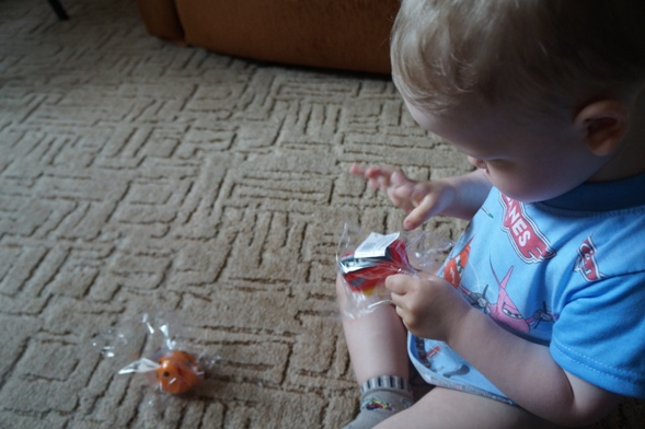 Оказывается, доставать игрушку из пакетика оооочень занятное дело! пакетик шелестит, игрушка-машинка манит, а все никак не достается ))) Минут через пять я все же показала, за какой край надо потянуть)) было много восторга! Очередная маШШШЫнка!!! Красная!!