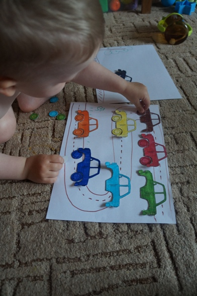 Подбирали машинам колеса согласно их цвета. 100% выполнение!