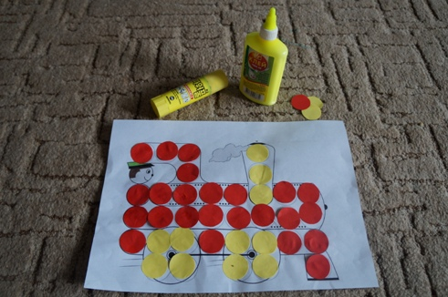Нашла рисунок уже с кружочками, распечатала, вырезала сами кружочки и дала сыну после обеденного сна. Пробовали два варианта клея. ПВА ему больше понравился, т.к. он видит что клей "вышел".
