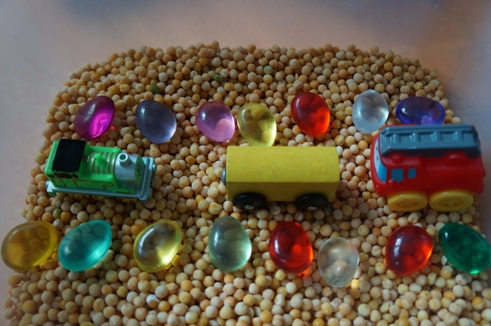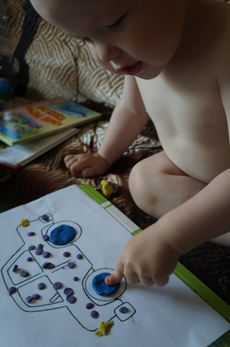 Т.к. мы просто обожаем пластилин, я долго думала какое бы занятие с ним придумать... и случайно увидела у кого-то машинку всю в зернах пластилина. УРА! идея нашлась! Конечно, до всей усыпленной пластилином машины нам еще далеко, внимания и интереса хватило на столько (особенно понравились припластилинивать колеса):