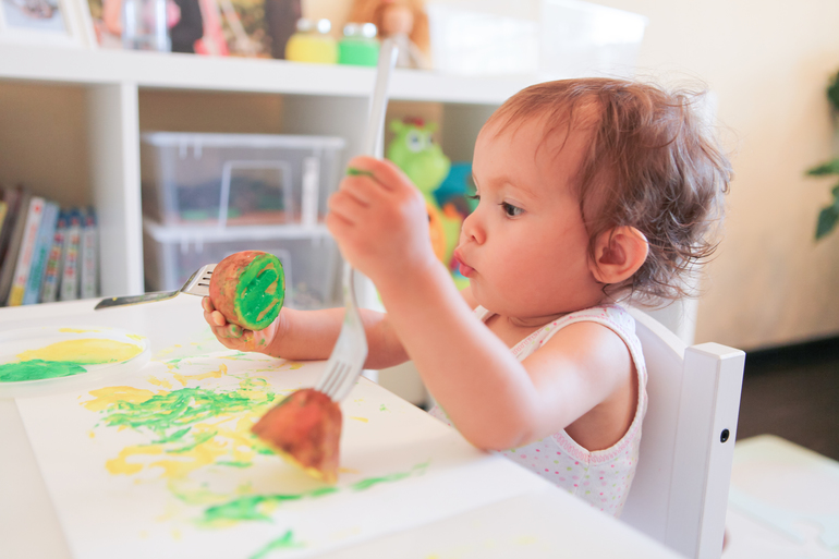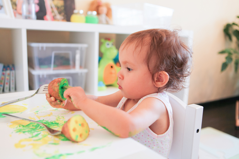 Уже перестала его доставать... А то если уж дашь — то всё, будет грызть его до конца.Штампы из овощей — попробуем! С вилкой тоже отлично придумано!