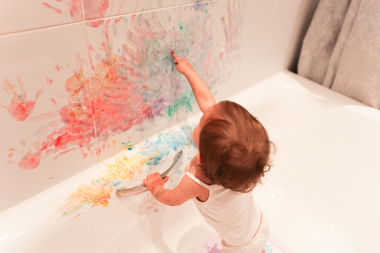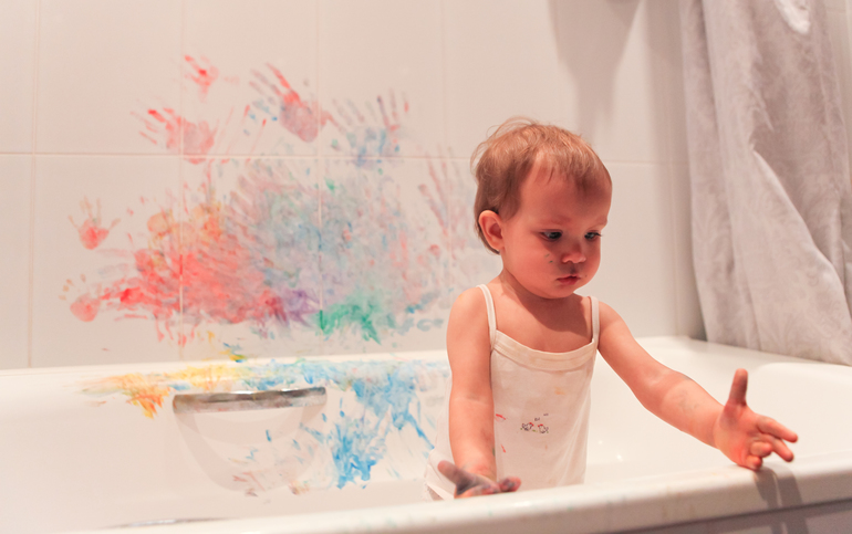 Это был первый наш опыт масштабного рисования. Взяли пальчиковые краски и отправились в ванную пачкать стены. Я ожидала восторг и бурю эмоций - ребенок смотрел на меня, как на сумасшедшую. Ну ничего, подумала я, подрастешь - сама просить будешь ;) Я рисовала вместе с Машулей, пыталась пробудить в ней озорство и шлепала на стену краску ладонью. Маруся аккуратно наносила пальчиком мазки, как в книжку для пальчиковых красок (точечено, как мы учили). Приплыли) Я показала ей, как оставлять отпечатки ладошек на стене. Потом пришел папа, Мару продемонстрировала ему наш шедевр, мы быстренько сфоткались на память,но дочка была уже не вдухе и требовала ее отмыть. Так что мы дружненько смыли с нее краску, а потом папа отмывал стены)