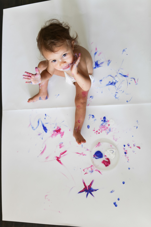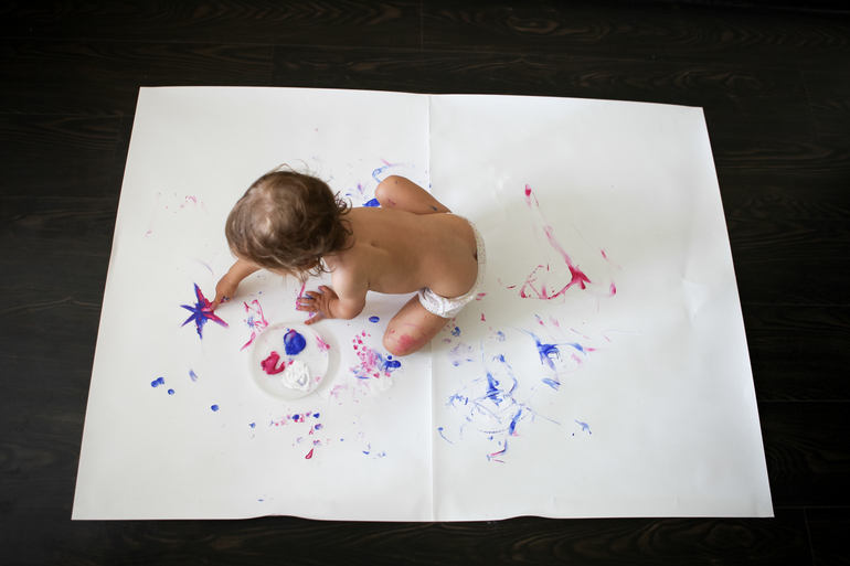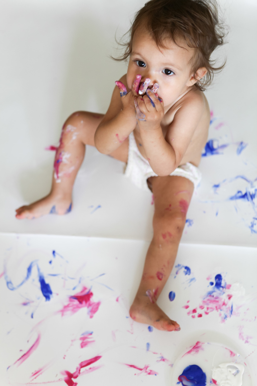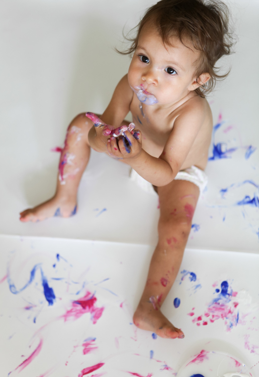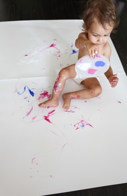Очень хотелось расширить пространство, на котором можно что-нибудь накалякать. Поэтому наклеила пару ватманов на пол, выдала палитру и вперед. Пачкать, пачкаться, пачкаться. Благо мы уже не так критично относимся к краске на теле. Немного порисовали на ватмане, а в конце опробовали боди-арт. Ну и краски объелись само собой)