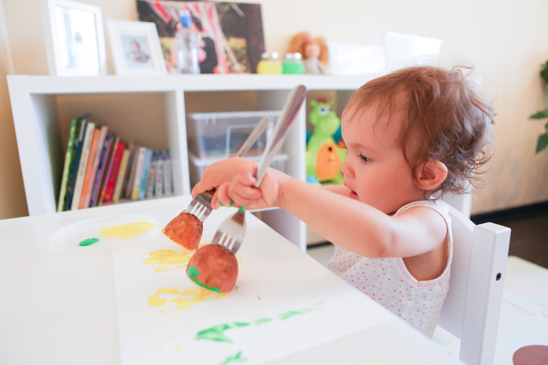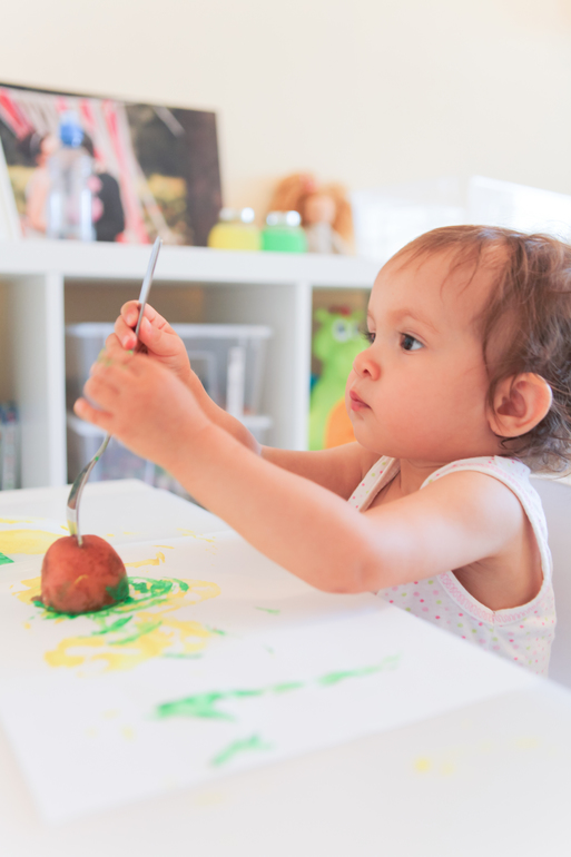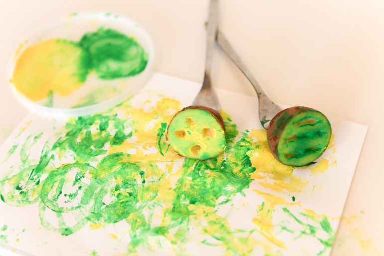 К следующему опыту нестандартного рисования мы вернулись уже гораздо позднее. Мой выбор пал на что-то менее экстремальное - рисование картошкой. Для данного эксперимента вам понадобятся картофелины, вилки и краски. Все очень просто - разрезаете картошку пополам, затем на срезанной стороне вырезаете любой узор (полоски, кружки и т.п.), втыкаете вилки в картошку, кладете палитру, ребенок макает картофелину в краску и штампует ее на лист бумаги. Марусе понравилось рисовать картошкой. Это было увлекательно и необычно.