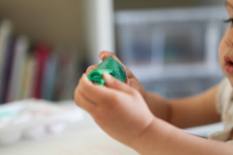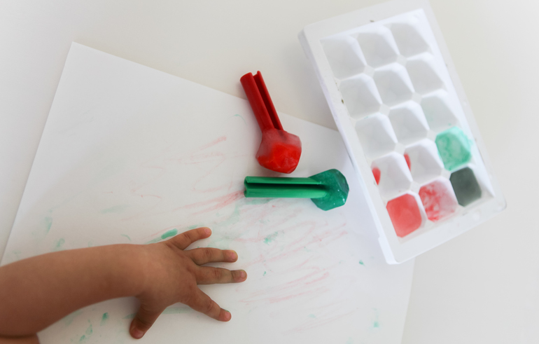 Еще один способ использовать подручный материал. Разводите краску в воде, разливаете в формы, вставляете палочки (я использовала палочки от игрушки Икеа с колышками) и в морозилку. Можно заодно повспоминать про свойства льда. Сначала рисунок получается очень бледным и едва наносится, но по мере таяния льда он становиться все насыщеннее, а наносить его все легче. Машуле очень понравилось! Особенно то, что он такой холодный) Она старалась выписывать что-то на листе, стучала льдинками друг об друга, постоянно трогала его.