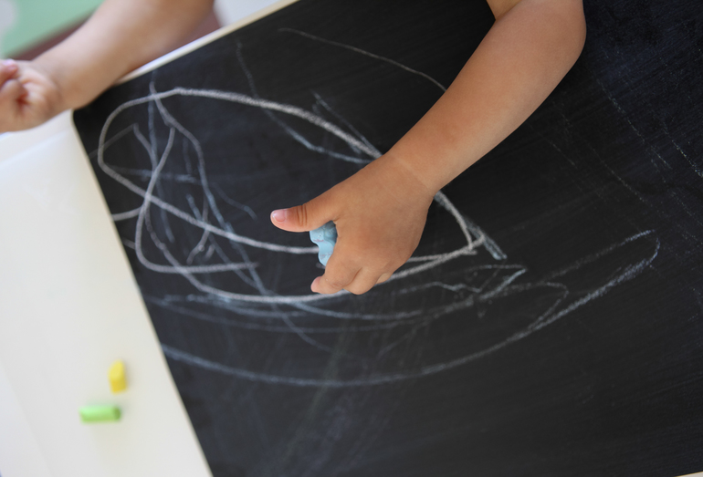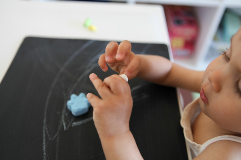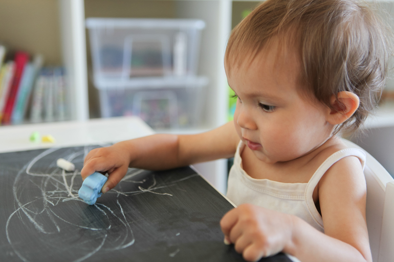 У нас давно висит на холодильнике магнитный меловой лист. Я купила его, чтобы записывать наши дела, потом писала режим дня Машули, затем расписание наших с ней занятий. Когда малышка подросла и мы стали активно гулять на улице, мне захотелось перенести наше рисование мелом на асфальте домой. Сначала мы рисовали прямо на холодильнике, а, когда у нас появился детский рабочий стол и стульчик, сняли магнитный лист и прикрепили его на стол. Вот что у нас получилось.