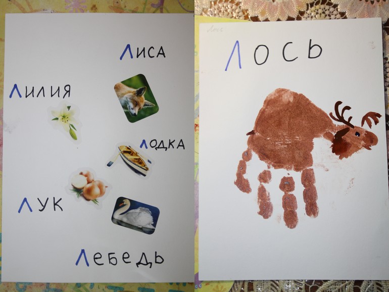 11. Наклеили картинки-предметы на Л и подписали их. Нарисовали ладошкой лося.