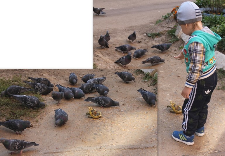 Взяли уже созревший подсолнух и отправились на улицу кормить голубей.