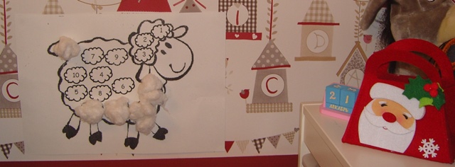 Адвент у нас висит с 17.12 (занятие проводили 18-20.12), поэтому мы просто выполняем задания и клеим на овечку ватные шарики. Отсчитываем сколько осталось дней до НГ (учим обратный порядок чисел с 15) и на календаре отмечаем сегодняшнюю дату.