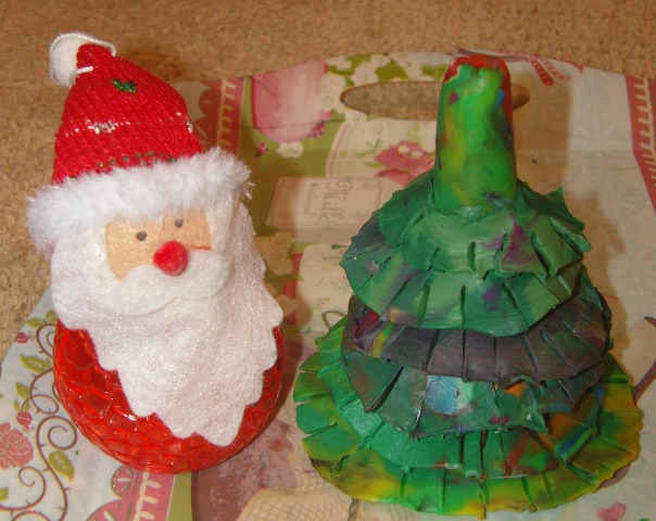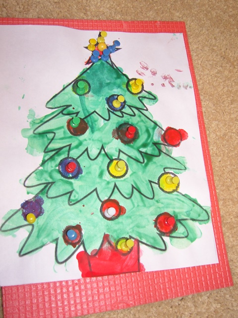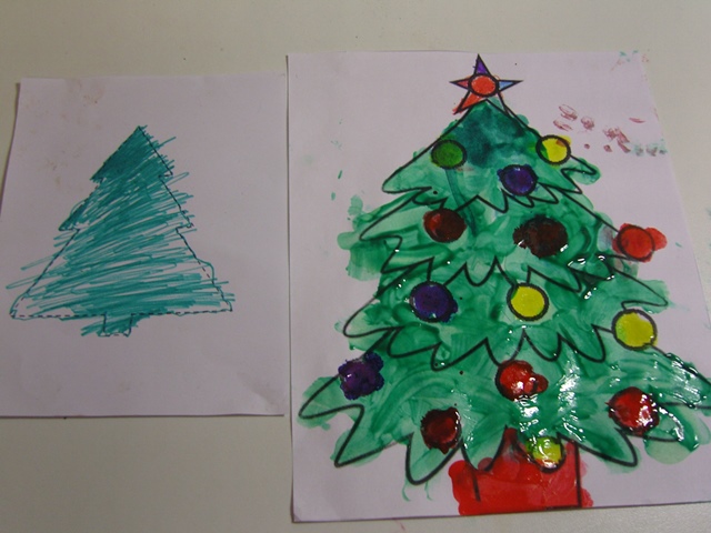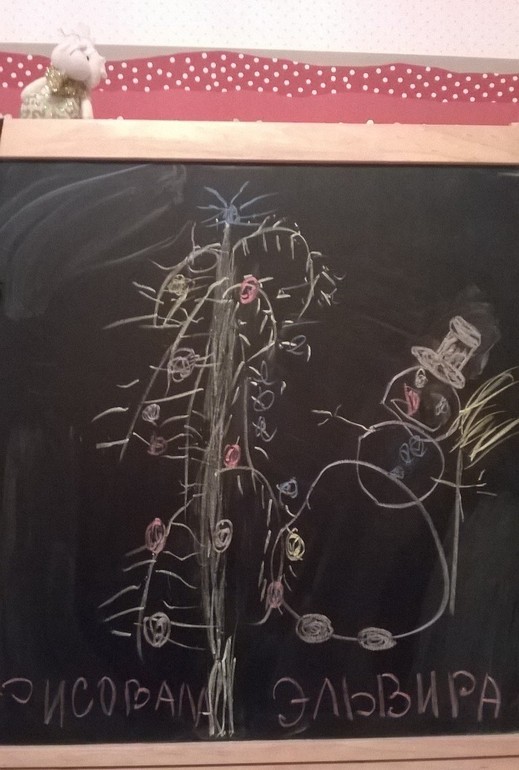 Еще нарисвали елку и снеговика мелками на мольберте - мне работа ооочень нравится (немного ель на березу похожа, но главное что самостоятельно все нарисовано!!!) Я помогла только со шляпой снеговика.