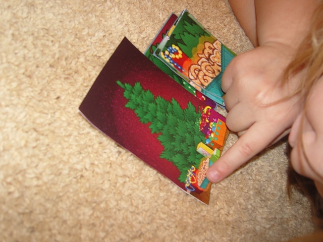 Конечно говорили об украшении елки: сначала рассмотрели украшения и нашли элементы на основной картинке, затем карточки просмотрели в нужной последовательности (не разрезали), затем Эльвиринка разрезала их на отдельные карточки и раскладывала по порядку под наряженной уже елкой!