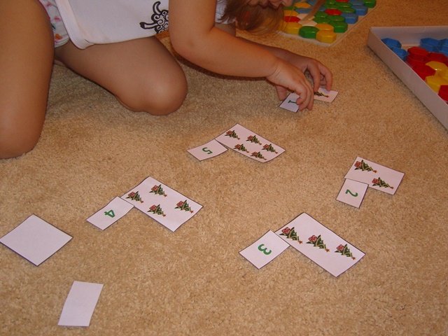 Считали елочки - к количеству подбирали цифру ,затем раскладывали в порядке увеличения и в обратном порядке (3, 2, 1 - уже на зубок выучила)