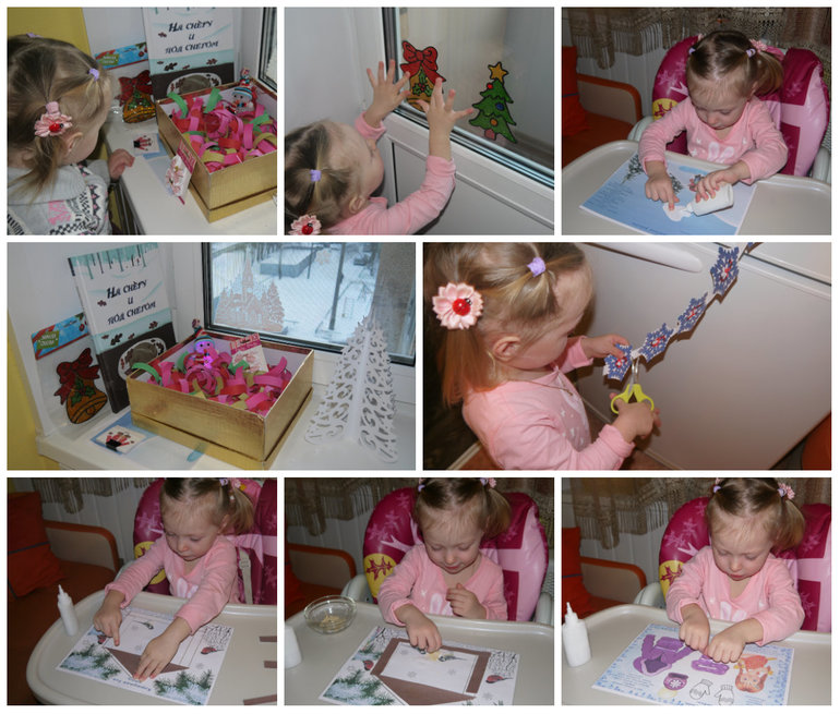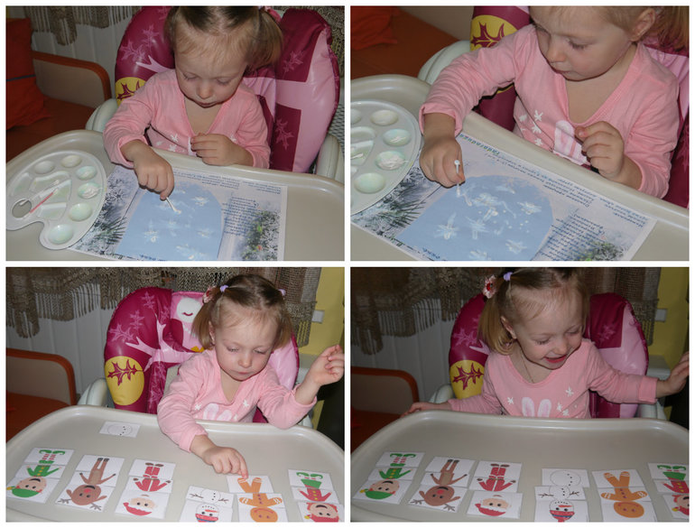 Аппликации (использовали альбом для творчества) - делали кормушку для синичек, насыпали корма, рисовали узоры на окнах, заплатки, собирали пазлы.