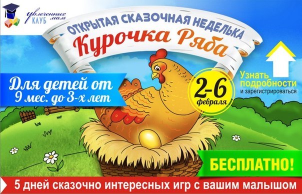 Приглашаем на БЕСПЛАТНУЮ тематическую недельку по сказке "Курочка Ряба" для малышей от 9 мес. до 3-х лет со 2 по 6 февраля! http://razvivash-ka.ru/wppage/otkrytaya-skazochnaya-n..