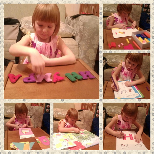 занятия я провожу через день, т.е. 3-4 раза в неделю по вечерам и в среднем все занимает 30-50 минут. Готовлюсь чаще утром на скорую руку, перед выходом на работу, ну или с вечера, но это роскошь! Всегда у нас обызательно буквы - слога в хоть каком-то виде + разные варианты на постановку руки или работа с ножницами + математика-счет + что-нибудь на внимание\логику или игры.
