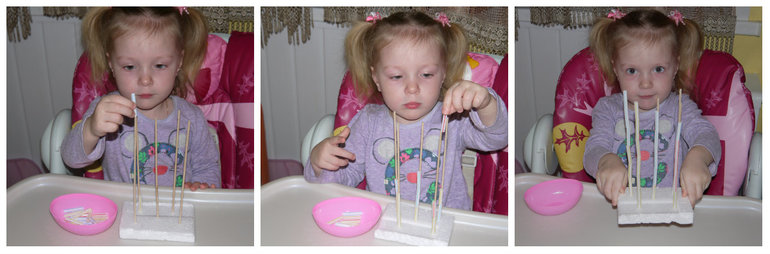 с водичкой рисует, непроливайку возьми. Да, с зубочистками ёжиков, можно как макароны использовать, суп варить, можно домики на лавочке складывать