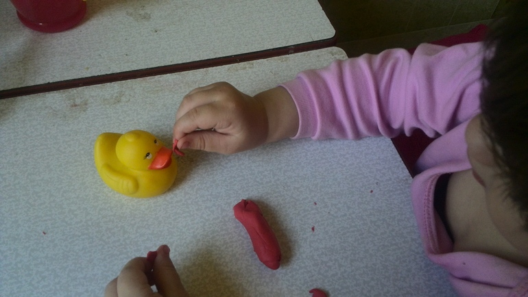 Потом мы с Алисой "кормим" уточку. Я взяла обычную резиновую утку, с которой Алиса привыкла купаться и предложила дочке её покормить: отщипывать от куска пластилина маленькие кусочки и давать их уточке. Алисон быстро включилась в игру, на каждый кусочек, даваемый утке приговаривался: "ам-ам-ам".