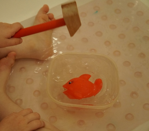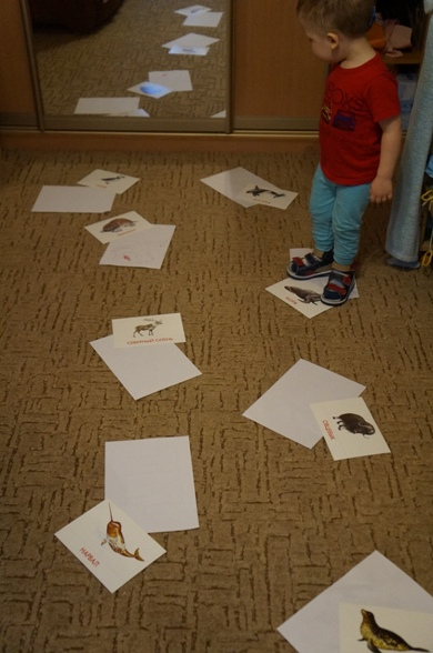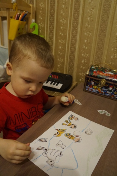 Раскидала льдины по полу, сначала прыгали по ним. Потом на каждую льдину посадили животное и скакали "2 прыжка-3 прыжка до косатки". А потом взяли карандаши и я выкрикивала: давай попадем в Лемминга, а теперь мама попробует попасть в Овцебыка! и т.д. очень понравилась эта игра!