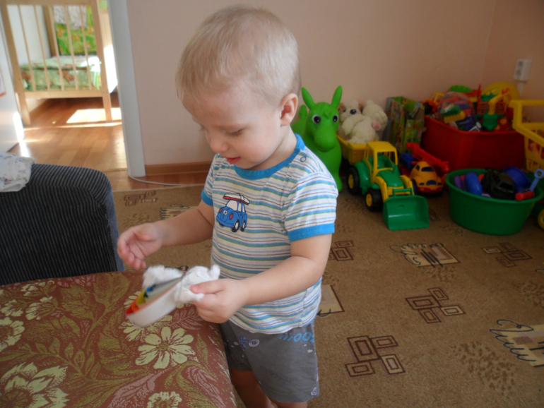 После сна играли в пальчиковые игры, занимались творчеством. Вечером играли с водой (делали дождик с помощью губки, лейки, ситечка), смотрели как дождик льется через пену для бритья.