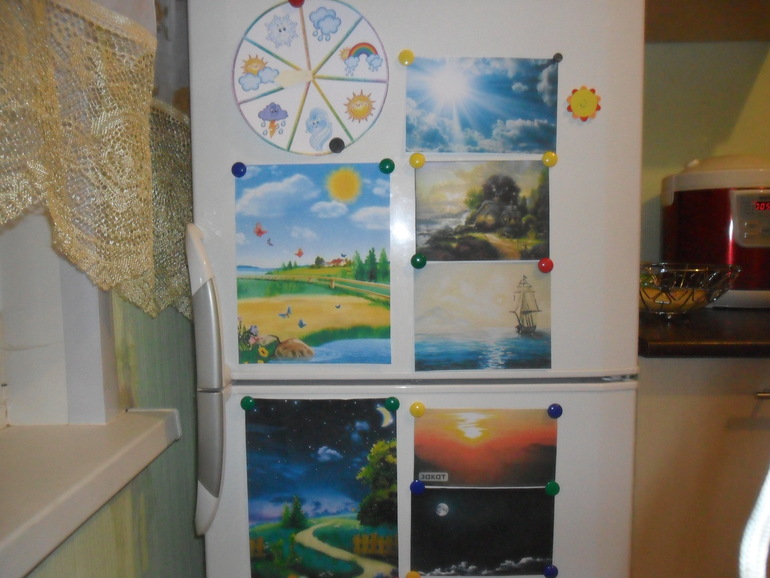 Первый день изучали солнышко. Рассматривали картинки на стене, посмотрели в окошко и отметили в календаре погоду.