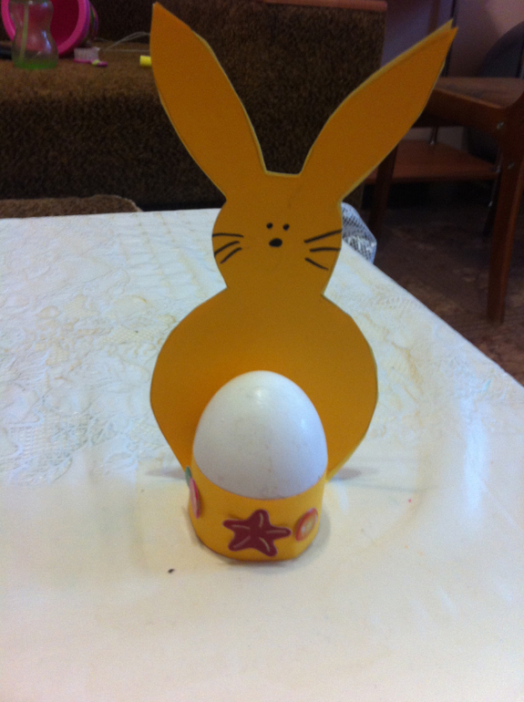 Вырезаем из цветной бумаги или картона зайчика и полоску. Полоску украшаем, сворачиваем, склеиваем концы и приклеиваем к зайчику. У меня была цветная офисная бумага поэтому для прочности я приклеила зайца к картону. Яичко мы еще раскрасим на выходных.