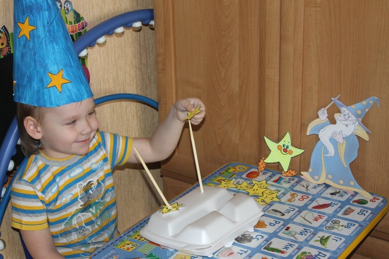 4. Звездочёт принёс нам звёздочки (весёлые и грустные), которые Артём должен был рассортировать и одеть на шпажки.
