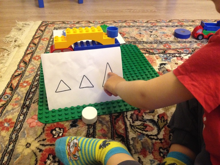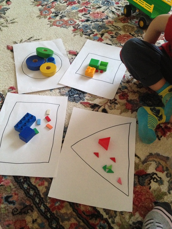 По материалам Светланы мы с Мишей позанимались математикой, а правильней сказать, поиграли и весело провели время! Следует отметить, что для занятия желательно иметь блоки Дьенеша. У нас их нет, поэтому некоторые задания мы упростили, изменили. Использовали кубики Лего, фигуры из сортера, кольца от пирамиды, детали магнитного конструктора. Познакомились мы с геометриками, заселили их в дома,