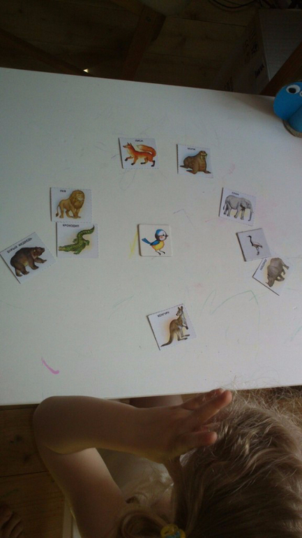 В первый день взяли всех животных. Начали со стишка С.Маршака «Где обедал воробей?» Сначала я рассказывала и выкладывала животных, потом Арина сама стала раскладывать животных под мой рассказ.