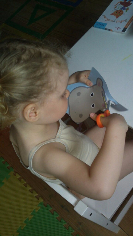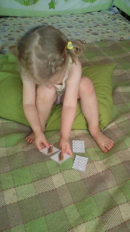 Играли в мемори. Арина не до конца понимает смысл игры, но ей очень нравится открывать карточки, пусть пока играет по своим правилам)