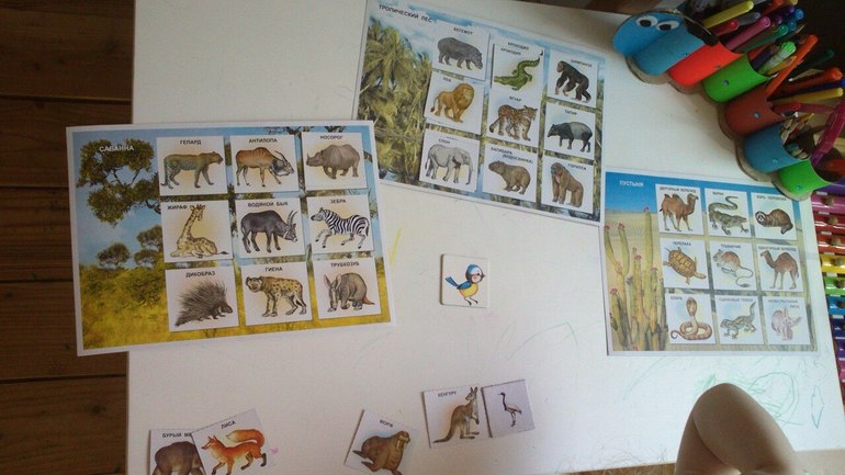 Затем с этими же карточками с животными играли в лото, узнали, кто же живет в Африке, а кто нет, потому как в стишке есть и морж, и лисица, и журавль)