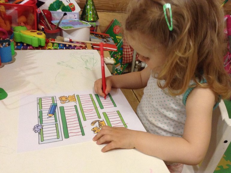 Начали вместе оформлять стенд: написали название, Арина дорабатывала) дописала буковки, а между ними подрисовала полоски, сказав как у тигра))