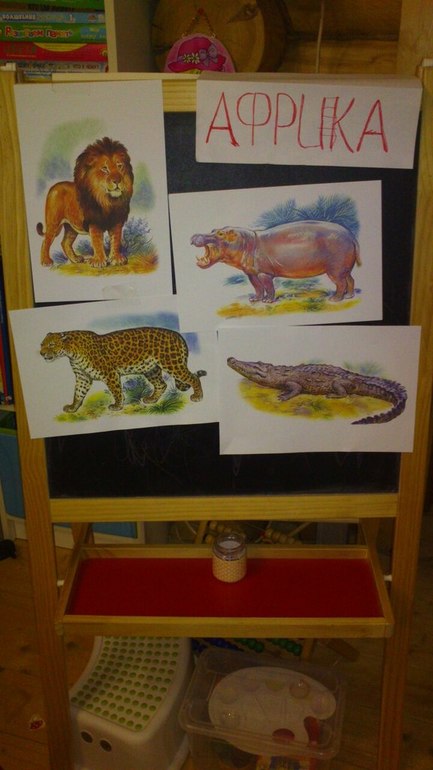 Тематические недели, дни и занятия от 0 до 3Сегодня мы взяли крокодила и бегемота. Повесили картинки, Арина сама приклеивала, отклеивала, перевешивала, приговаривая: «Смотри, как красиво!»
