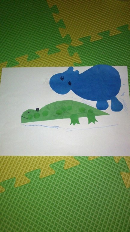 Сделали аппликацию крокодила, а потом Аришка сказала: «Жаль, что мы его посредине сделали, бегемоту места нет», поэтому бегемота посадили в угол)