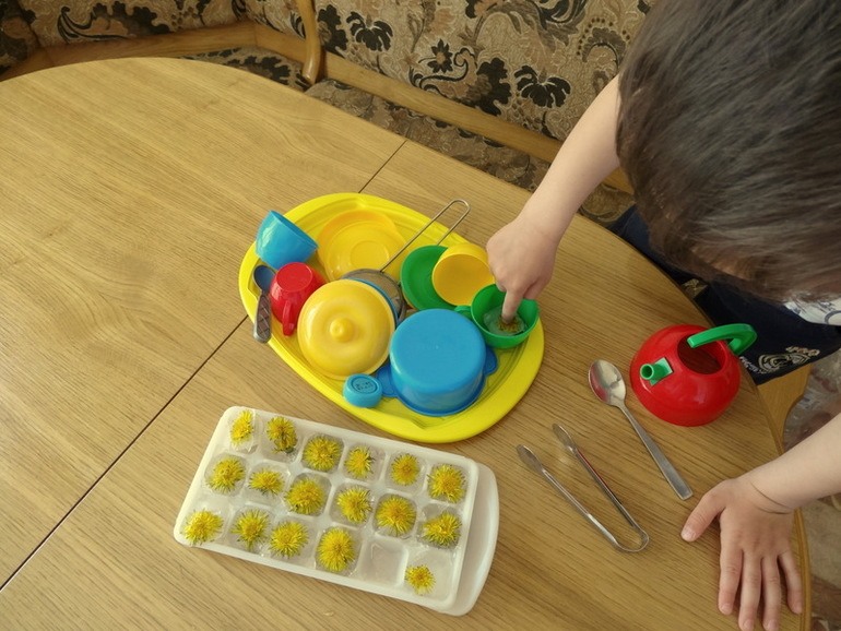 Ну и гвоздь программы: одуванчиковый лед! Этого хватило на 40 минут )) Я и кушать приготовила, и убрала везде, и посуду помыла, а лед все был в почете. Суп из него варился, и чай заваривался... Чудесное занятие.