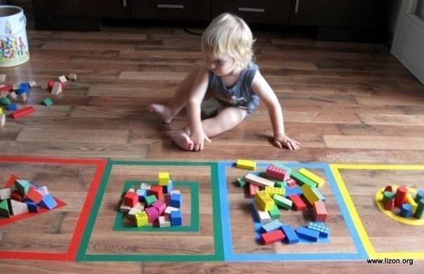 2. Раскладывать вещи по цветам (подойдут разноцветные кубики, лего, мячики, деревянные бусины и мелкие одноцветные игрушки)