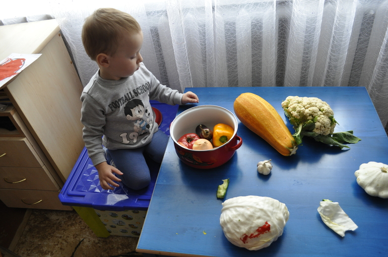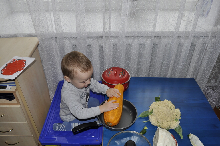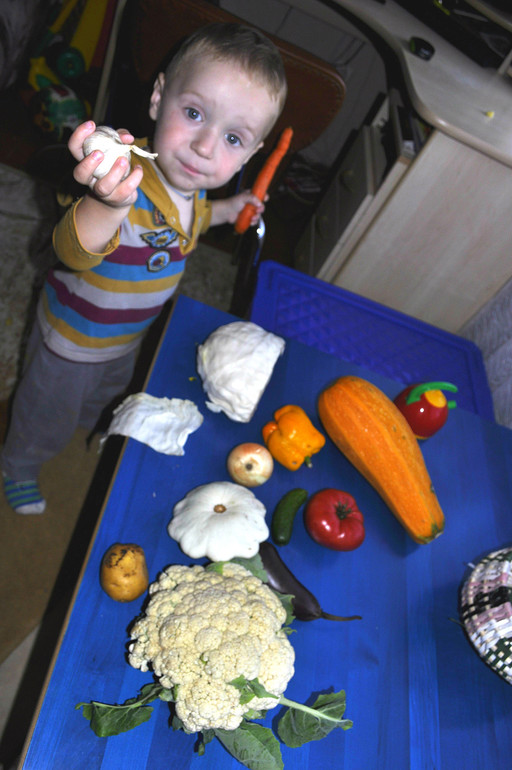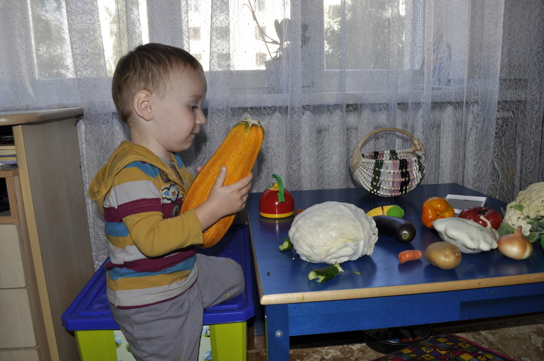 Дамирке играть, изучая овощи, очень понравилось, целый день их тягал.