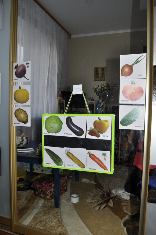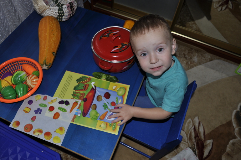 Затем рассматривали картинки, а Дамирка по ним искал овощ на столе.