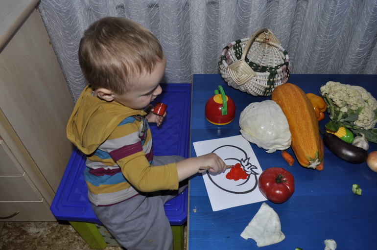 Дамирка разукрашивал помидор, смотря на настоящий, получилось я бы сказала отлично, без моей помощи.