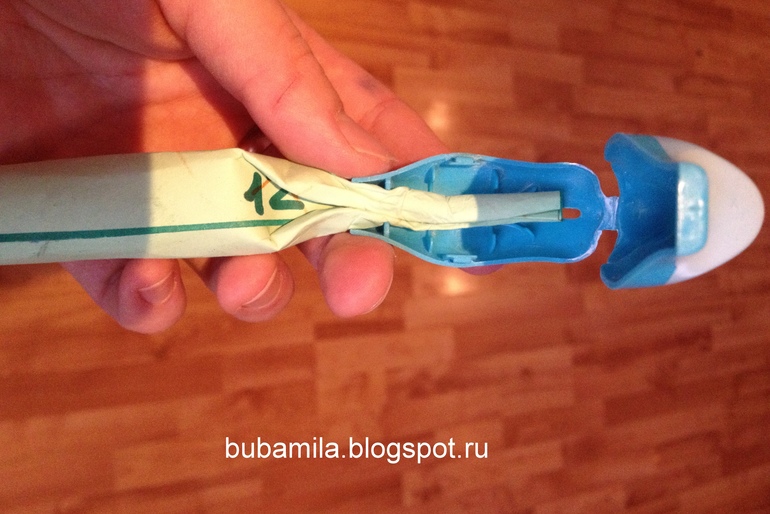 Заверните верхний конец трубочки, так чтобы он поместился в голову игрушке.