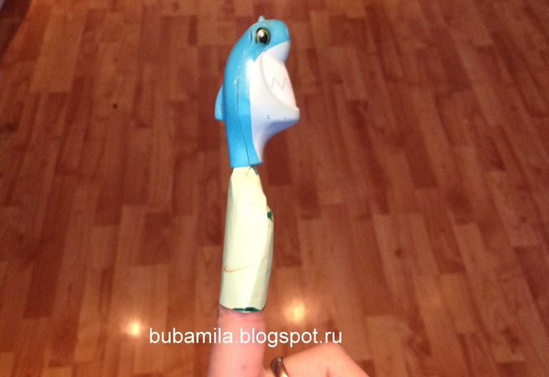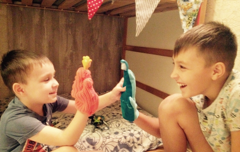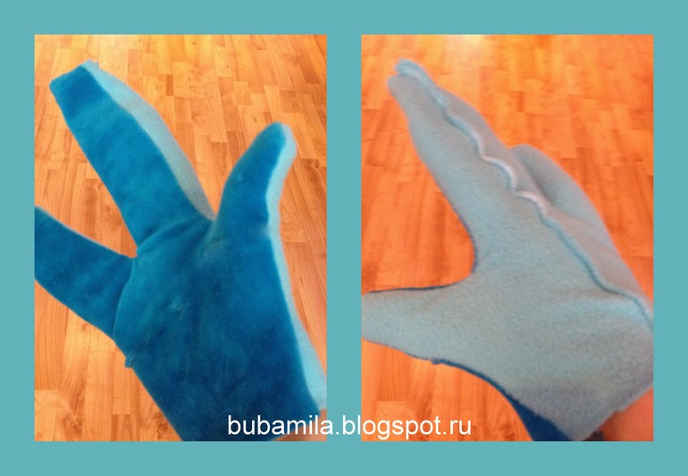 Поэтому решила сделать из них перчаточные куклы для нашего домашнего театра. Принцип такой игрушки довольно простой: средние пальцы управляют головой, крайние - руками.