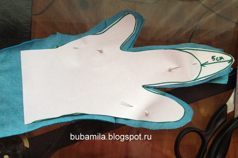 Теперь займемся собственно перчаткой. Выкройка строится очень просто. Обведите вашу руку следующим образом. Добавьте запасные 5 см на среднюю часть перчатки.