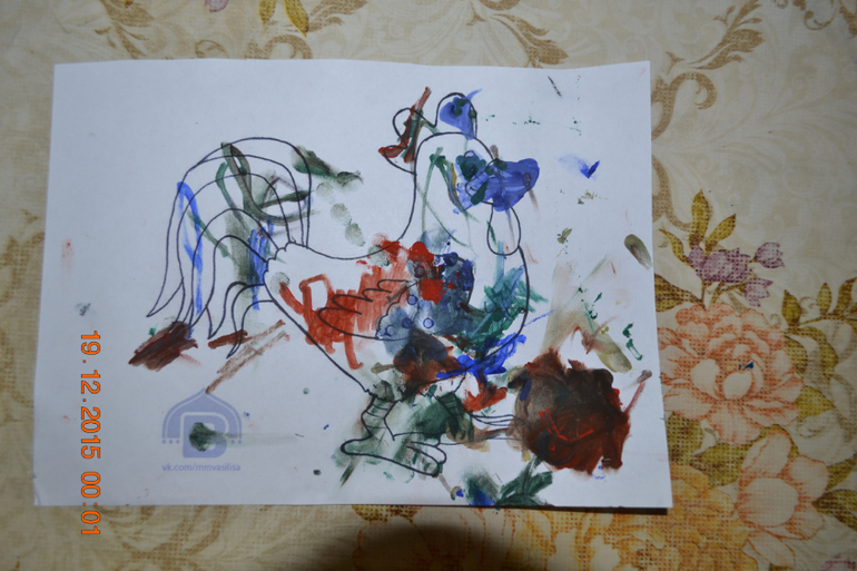 Сначала он рисовал как и положено, ватными палочками, но потом в ход пошли пальчики))) Петушок Ансара (6 лет)