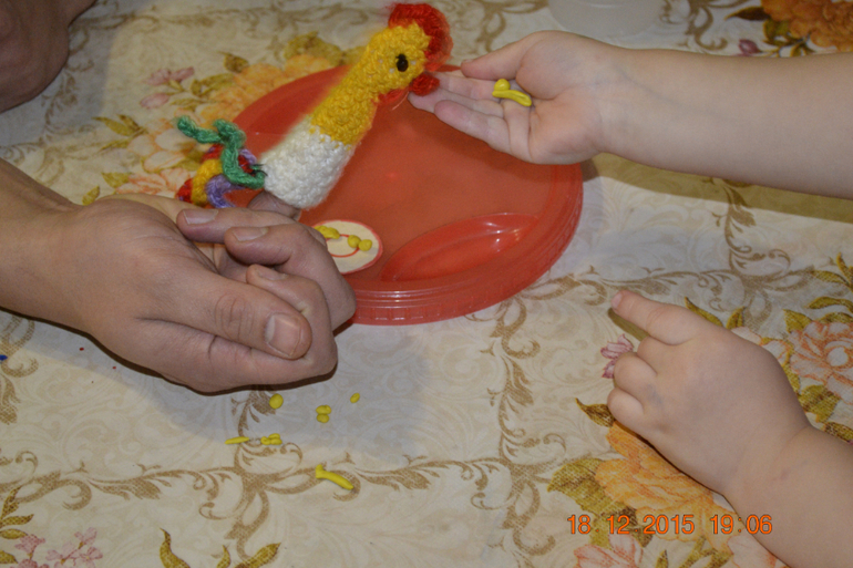 Поблагодарив нас, он ушёл. Но до ухода, мы накормили его пшеном (катали из пластилина шарики)